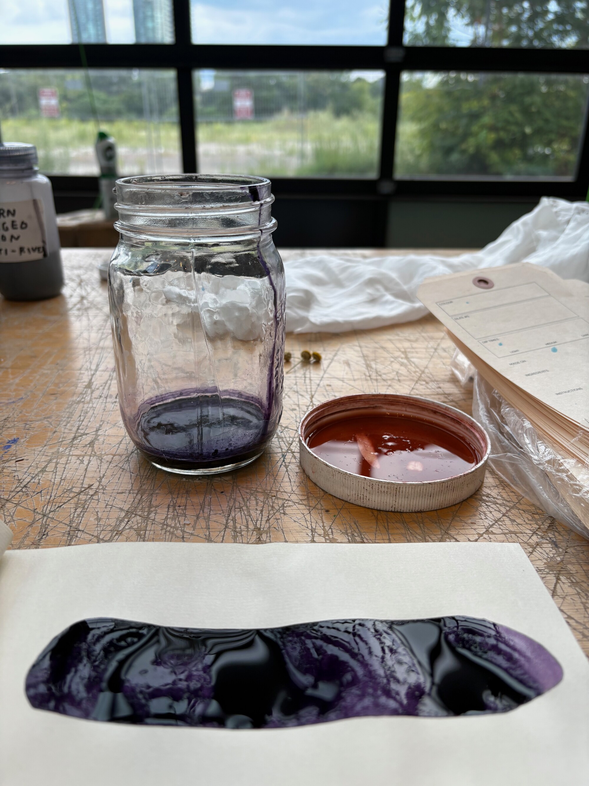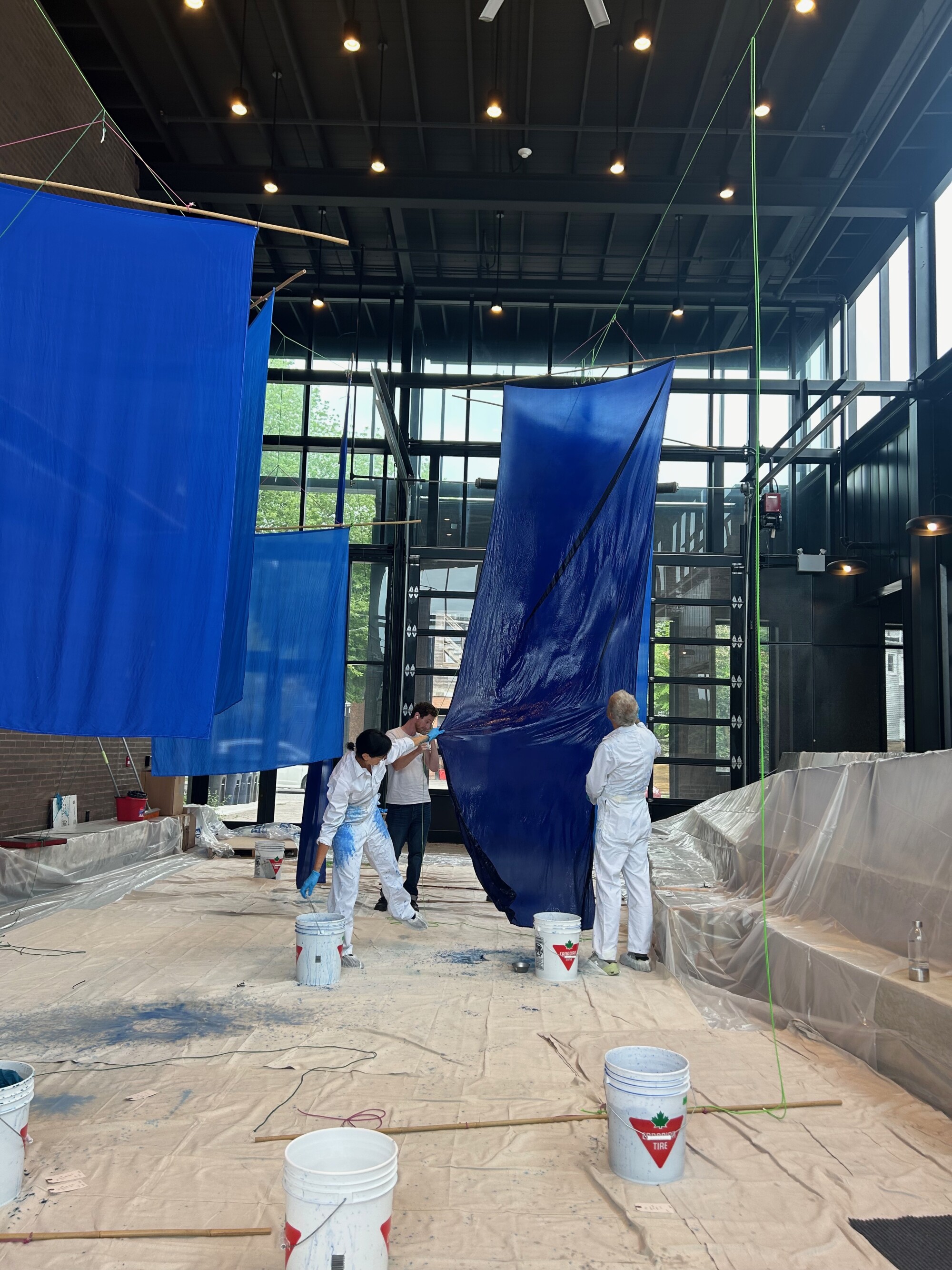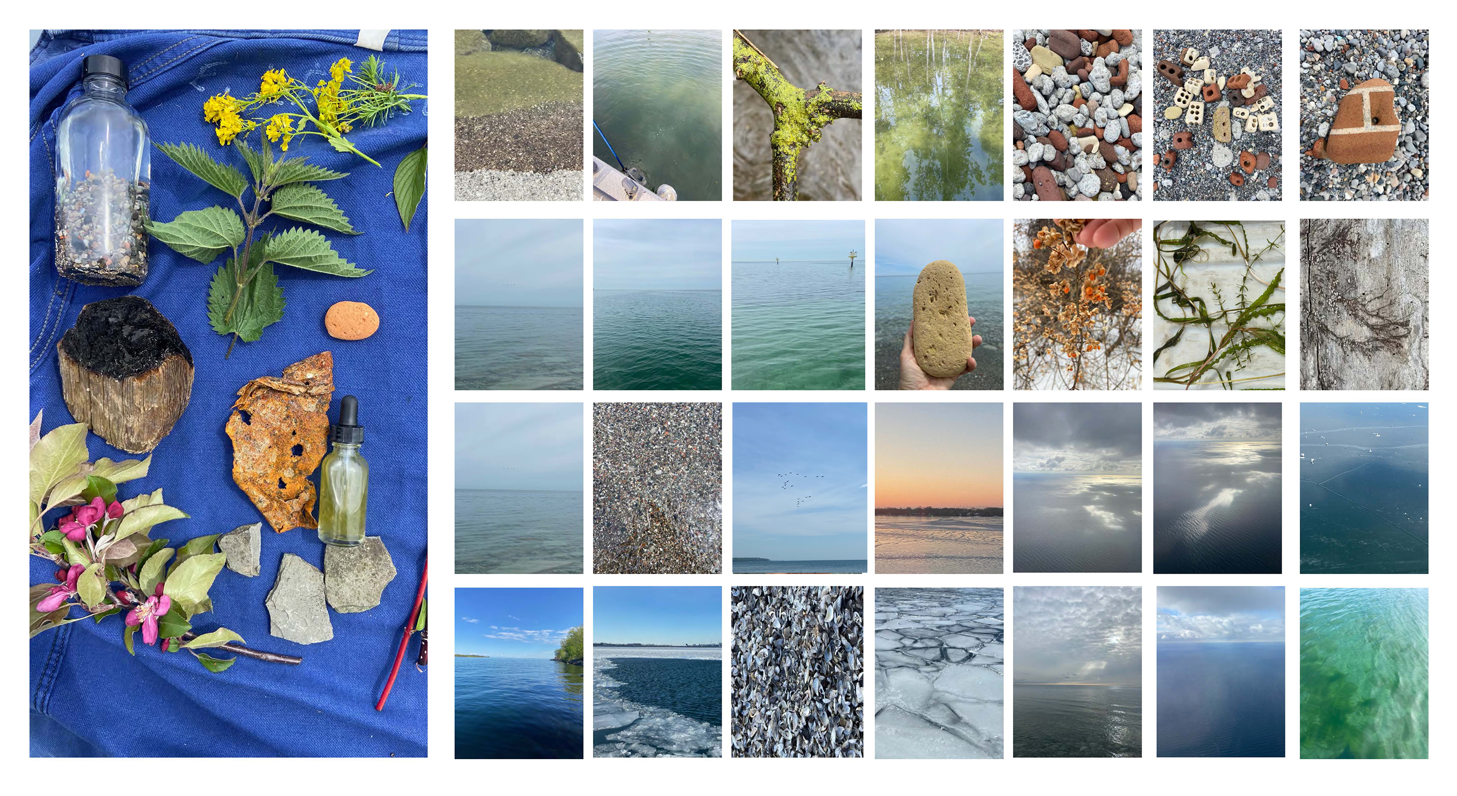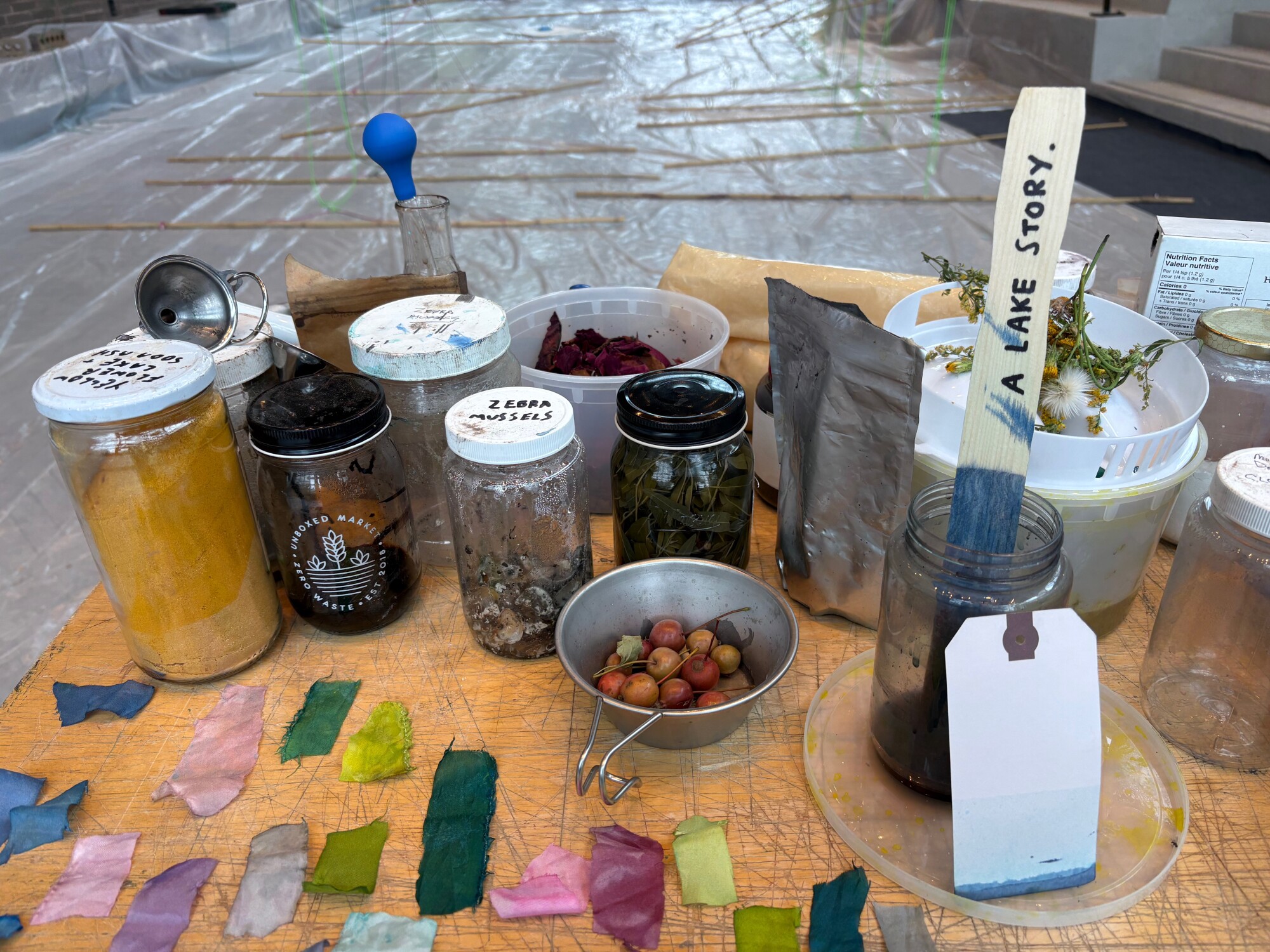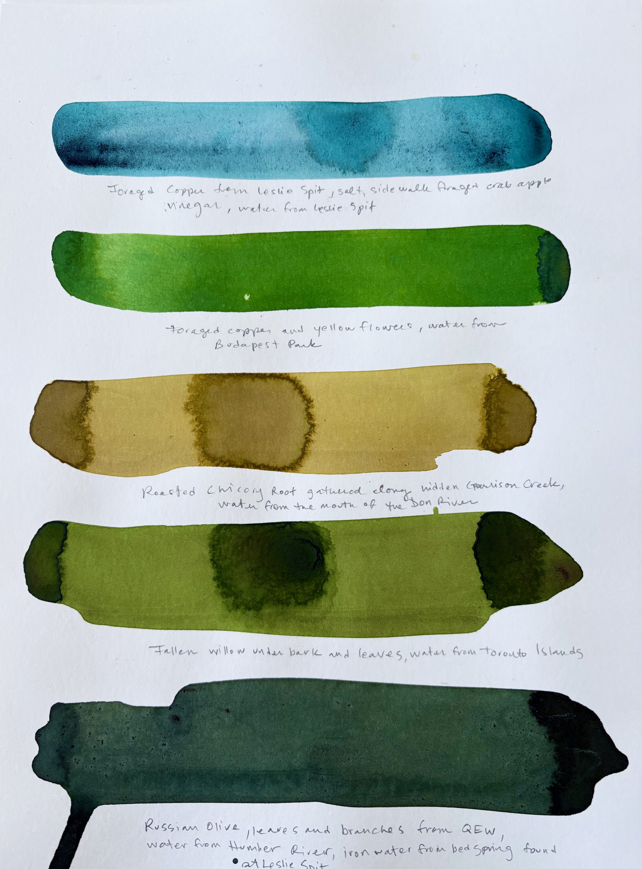 Gathered water and colour story ingredients such as acorn, algae, red brick, yellow brick, copper pipe, wild grape, wild rose, tansy, goldenrod, iron bed spring, mulberry, dogwood bark, wyellow willow, red pine, russian olive, burdock, lake clay, biogenic ochre were collected from Gibraltar Point, Leslie Street Spit, Sunfish Cut, Budapest Park, the re-naturalized Don River, Keating Channel, and including along the hidden and buried rivers of Toronto.