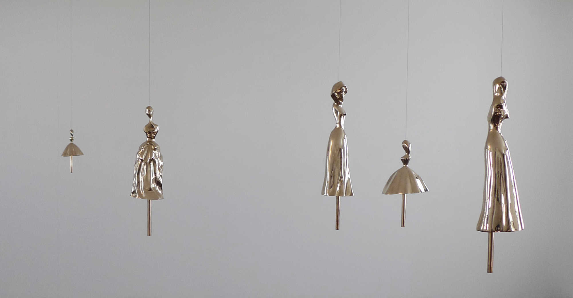 The bell forms are made from casts of the hollow interior spaces of female porcelain figurines. They are positive versions of these hidden empty spaces, which retain a faint and almost ghostly resemblance to their outer shells.